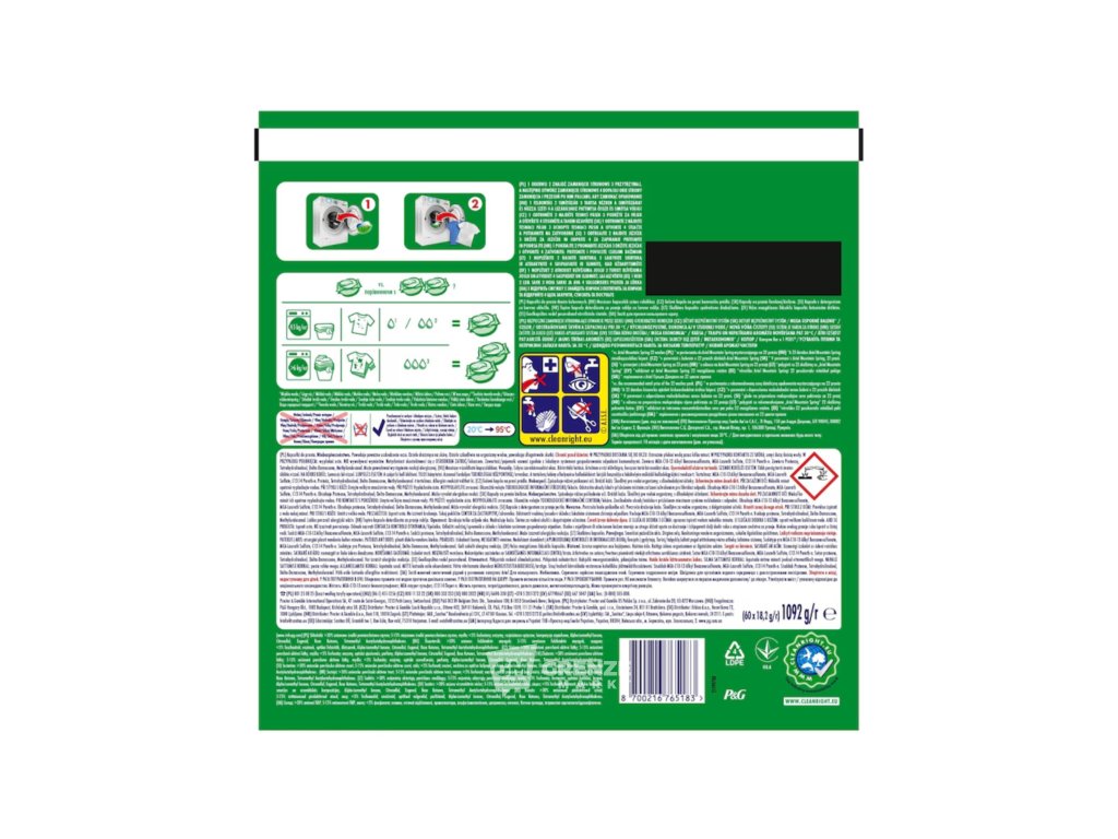 Vložte jednu kapsli na dno prázdného bubnu pračky a poté vložte prádlo. Zvolte vhodný prací program; i krátké programy a studená voda zajistí hluboké čištění. Nevhodné pro vlnu a hedvábí.