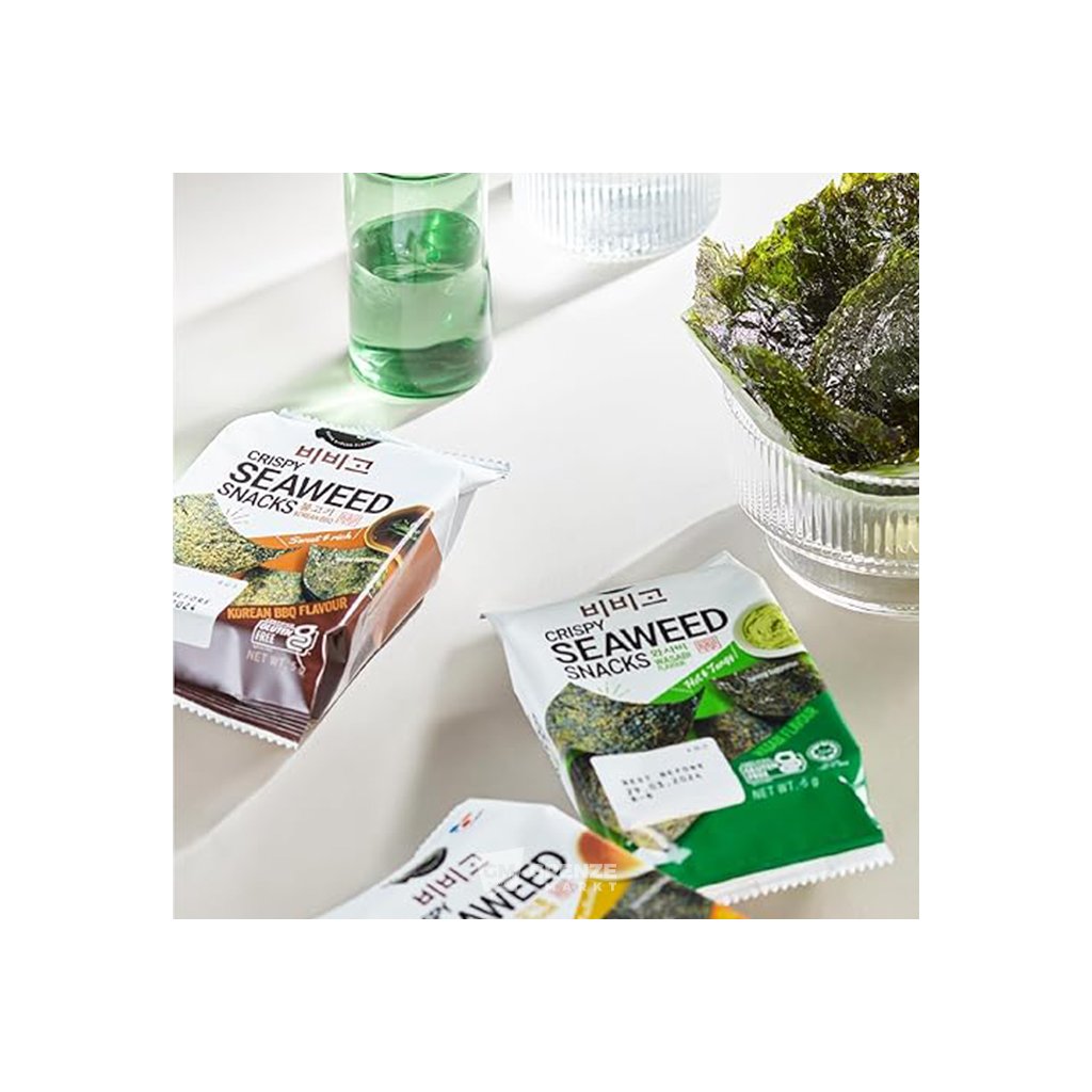 Dopřejte si jedinečné křupavé řasy s ostrou chutí wasabi – stačí jedno sousto a neodoláte. Bibigo křupavé mořské řasy Wasabi vám přináší chuť pravé korejské tradice v praktickém balení.