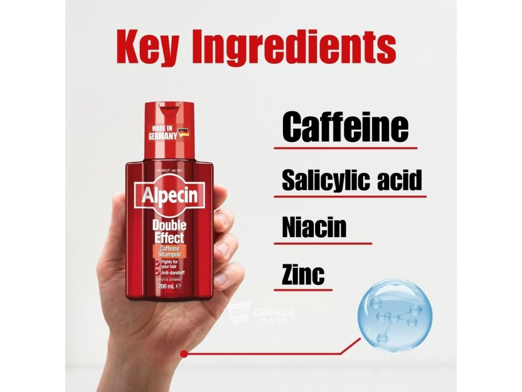 - Alpecin-Koffein-Komplex: Enthält Koffein, Zink und Niacin, stärkt die Energie des Haars und verleiht ihm Dichte und Kraft.