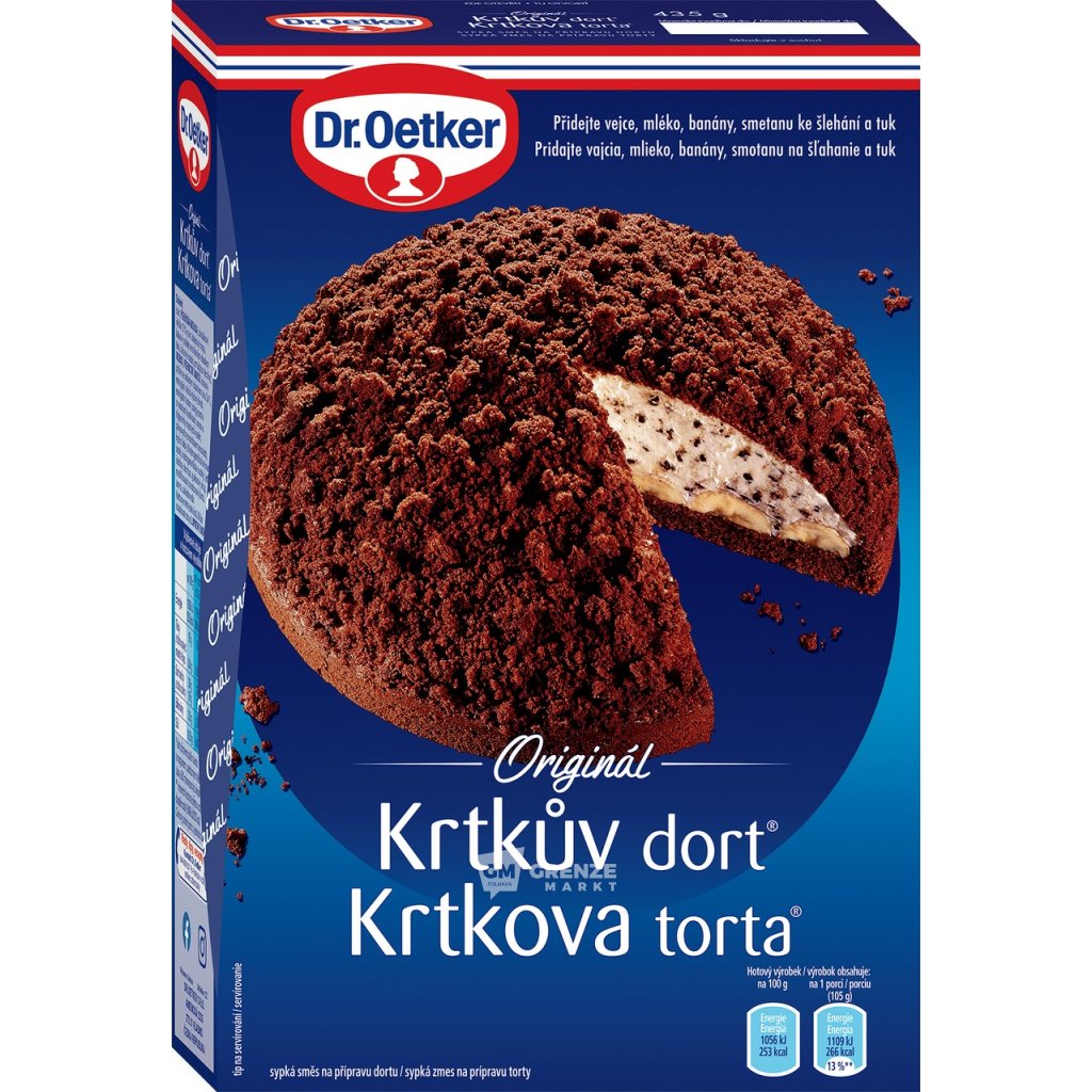 Dr. Oetker Original směs na Krtkův dort 435 g je ideální volbou pro milovníky evropských dezertů s výraznou čokoládovou chutí a jemným banánovo-smetanovým krémem. Tato směs vám umožní snadno připravit efektní dort podle originální receptury Dr. Oetker, vhodný pro rodinná setkání i slavnostní příležitosti. Díky předem připravené směsi v kombinaci s běžnými čerstvými surovinami je příprava jednoduchá a zvládne ji i začátečník.