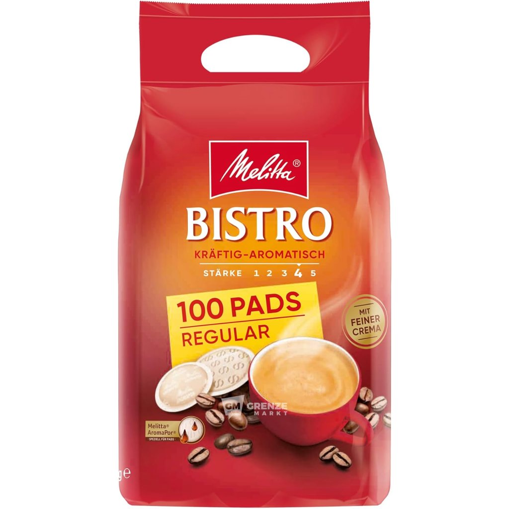 Melitta Bistro Kräftig-Aromatisch Coffee Pads 100x7g deliver a bold coffee experience full of energy. Carefully selected beans are medium roasted under strict control to preserve their balanced flavor and smooth crema.