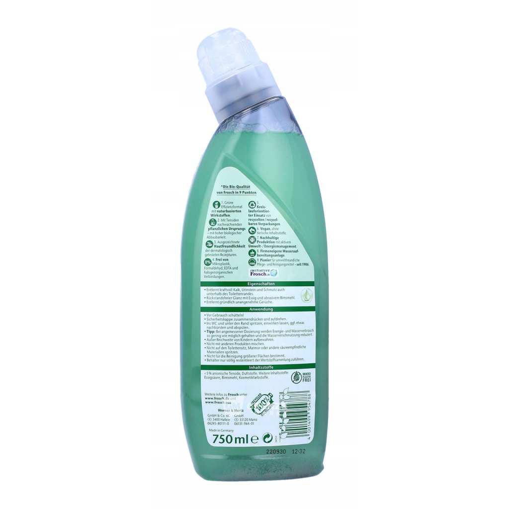 Frosch WC čistič s octem 750ml je účinné řešení pro čištění toalety s přírodními složkami, které odstraňuje odolné nečistoty, vodní kámen a usazeniny moči. Díky vylepšenému složení s pemzou účinně rozpouští nečistoty, aniž by poškodilo povrch keramiky. Přírodní vůně octa neutralizuje nepříjemné pachy a zanechává svěží čistotu. Ideální volba pro hygienickou a ekologickou péči o toaletu.