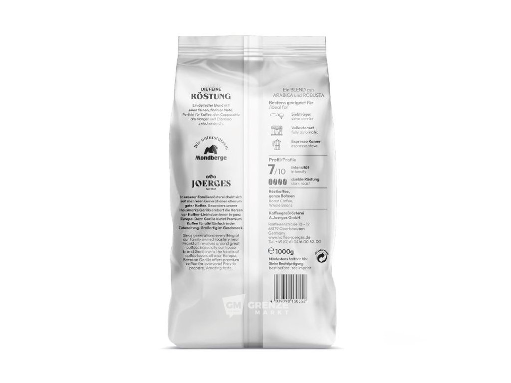 Gorilla Espresso Delicato zrnková káva 1 kg přináší intenzivní italský zážitek z kávy, který spojuje vybrané zrna Arabica z jihoamerických vysočin a Robusta z Asie. Vůně s tóny čokolády, květin, medu a oříšků vytváří dokonale vyváženou a jemnou chuť v každém šálku espressa.