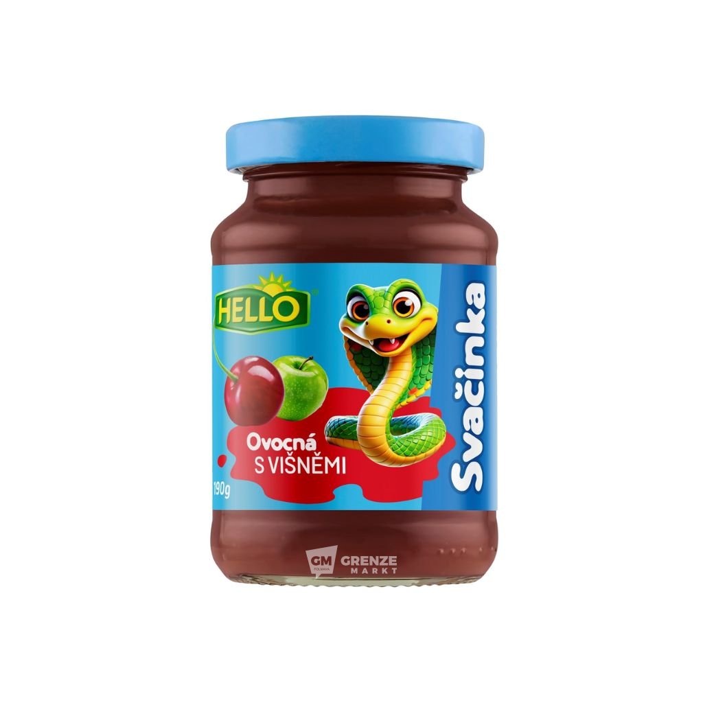 HELLO Ovocná svačinka s višněmi 190 g sklo je ideální volbou pro výživnou svačinu, vyrobenou z pravého ovoce s vysokým podílem jablek a kyselkavých višní. Výrobek má jemnou konzistenci, snadno se konzumuje a je dobře stravitelný, vhodný pro malé děti v období příkrmů i pro dospělé, kteří preferují ovocné snacky podle evropských standardů.