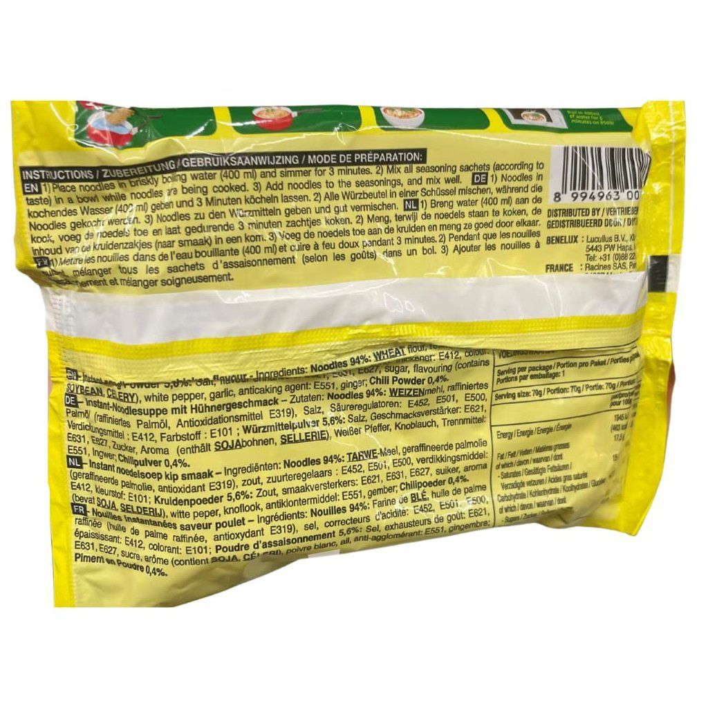 Složení: Nudle 94%: PŠENIČNÁ mouka, rafinovaný palmový olej (rafinovaný palmový olej, antioxidant E319), sůl, regulátory kyselosti: E452, E501, E500, zahušťovadlo: E412, barvivo: E101; Kořenící prášek 5,6%: sůl, zvýrazňovače chuti: E621, E631, E627, cukr, aroma (obsahuje SÓJOVÉ boby, CELER), bílý pepř, česnek, protispékavá látka: E551, zázvor; Chilli prášek 0,4%.
