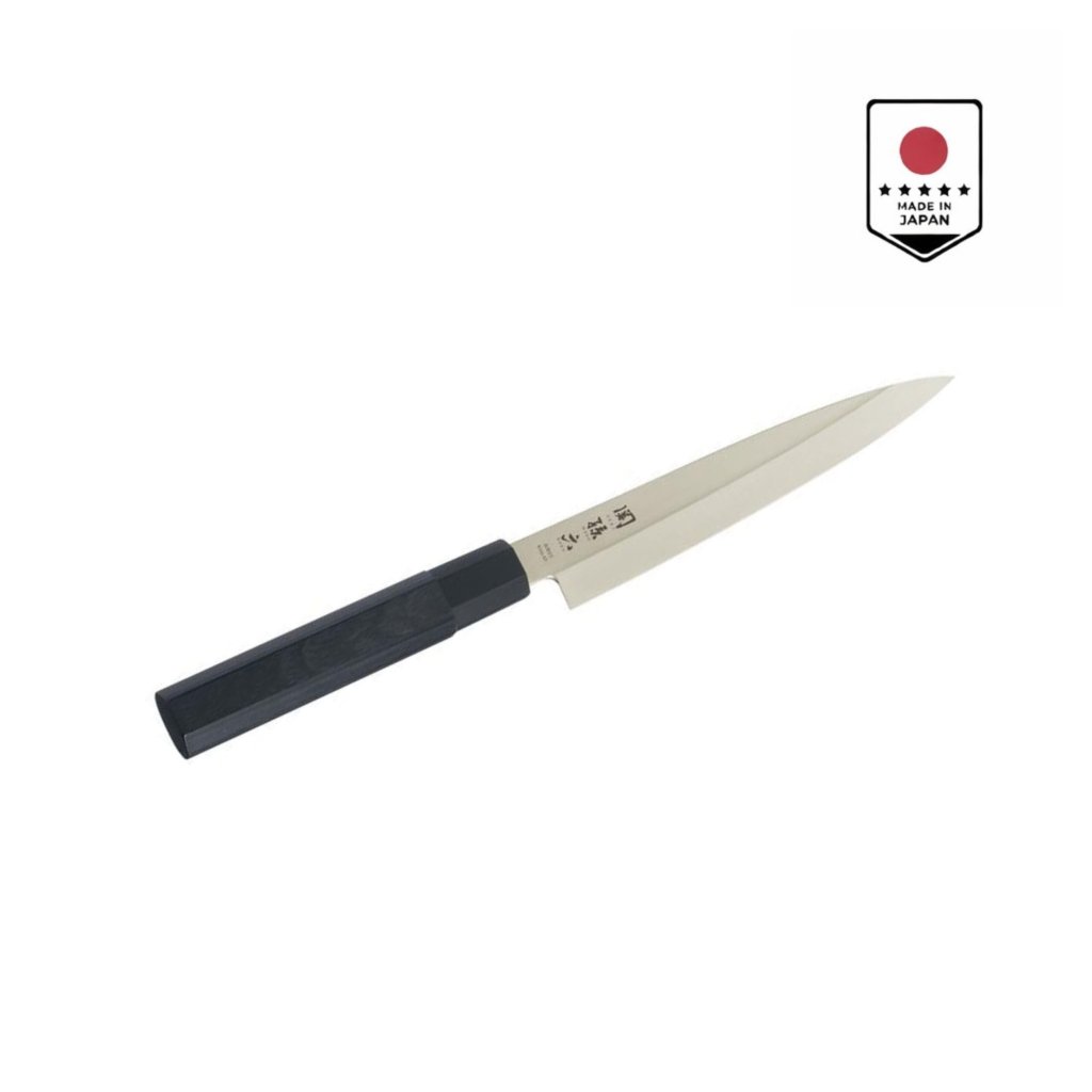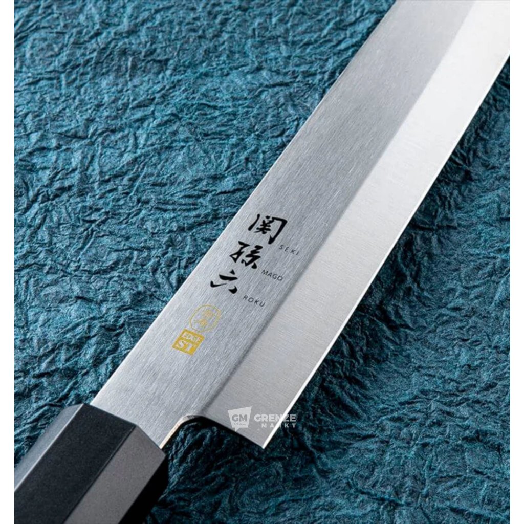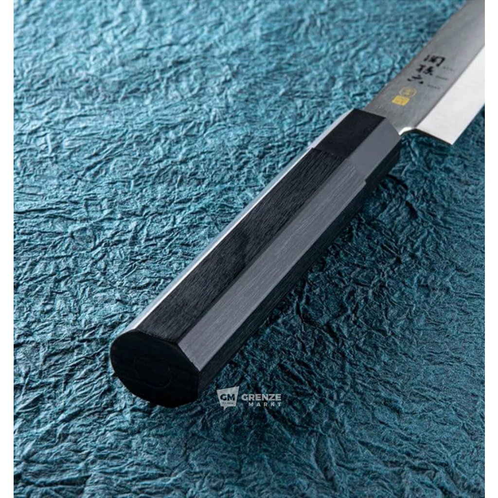 Čepel je vyrobena z vysoce kvalitní molybden-vanadiové nerezové oceli s tvrdostí přibližně 58 HRC a je jednostranně broušená v souladu s tradičními japonskými sashimi noži. Tenký a úzký profil čepele umožňuje rovné, hladké a maximálně přesné řezy, které zachovávají strukturu rybího masa i jeho přirozenou krásu.