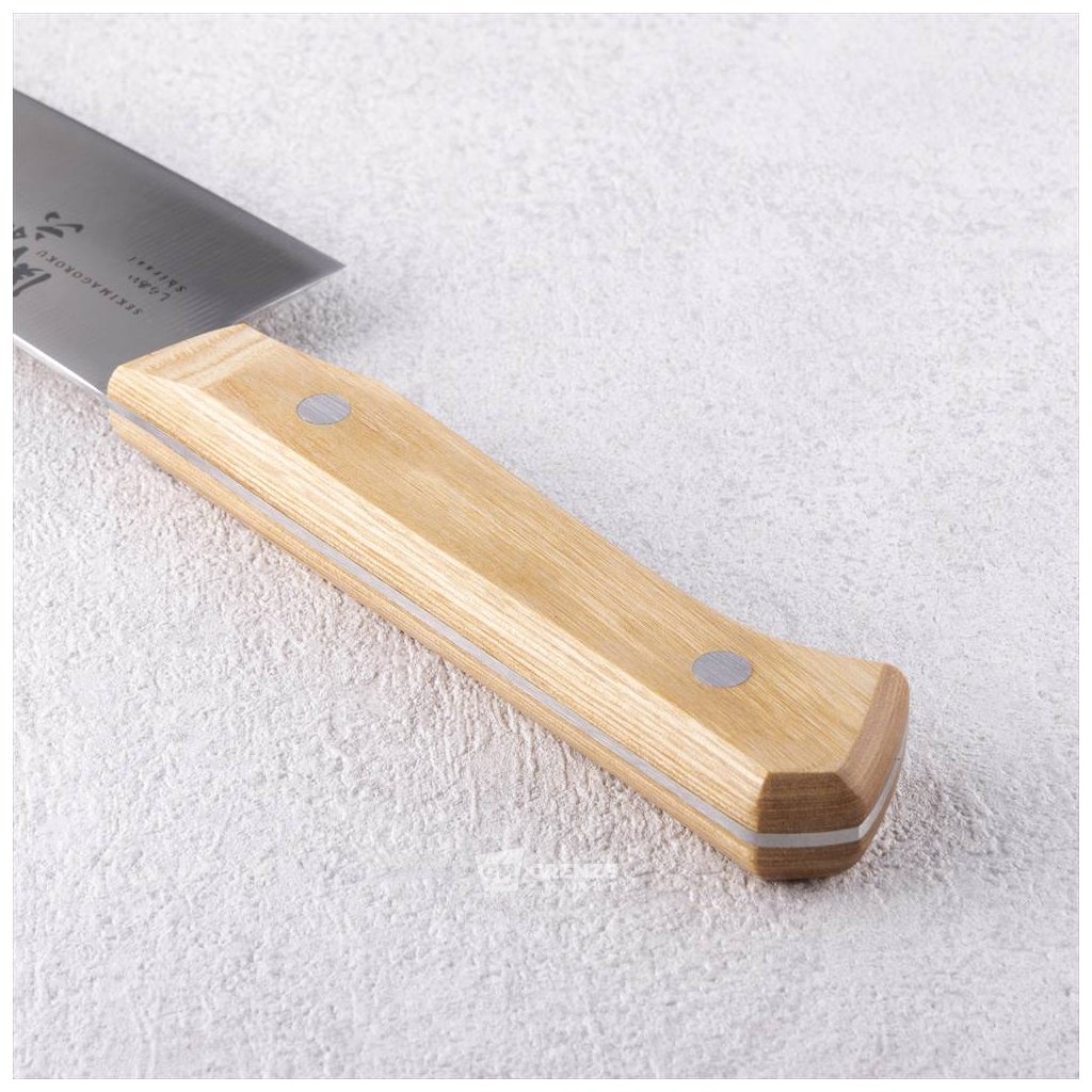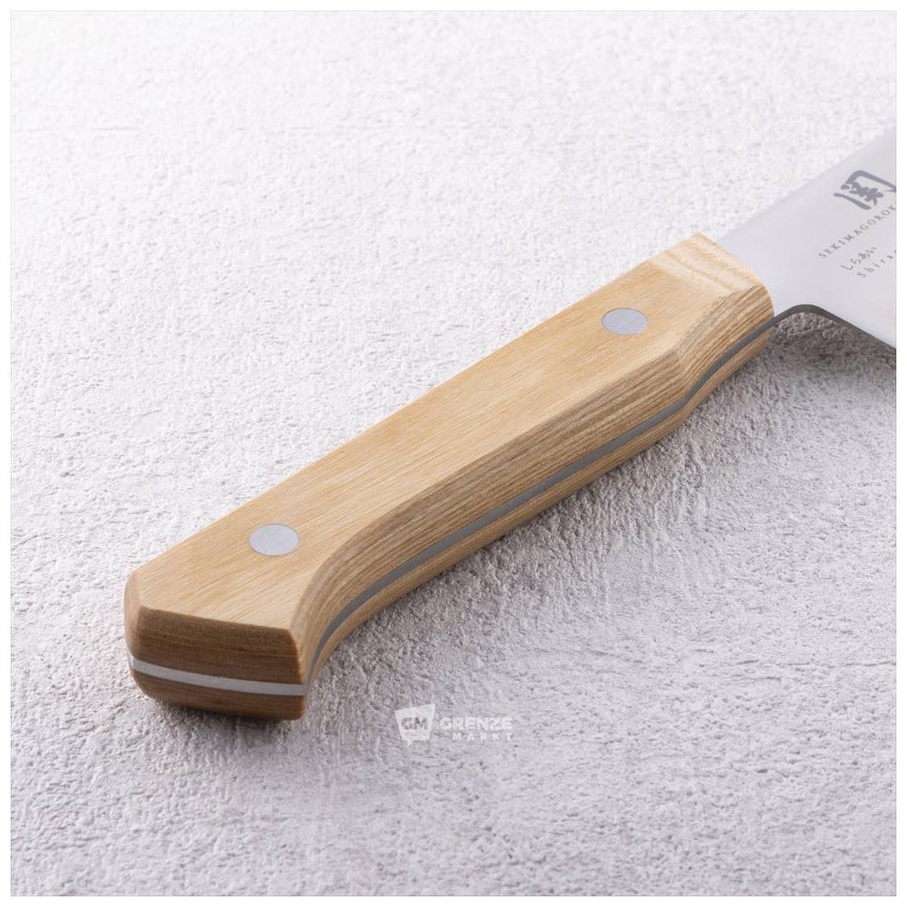 Rukojeť z vrstveného tvrzeného světlého dřeva s konstrukcí full tang zajišťuje optimální vyvážení hmotnosti. Přirozená krása světlého dřeva v kombinaci s moderním designem nabízí nejen luxusní vzhled, ale také vynikající ergonomii a pohodlný úchop.