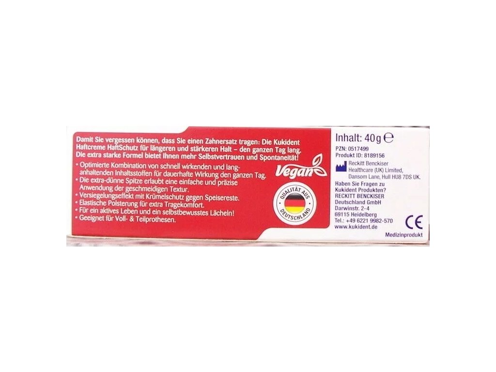 Kukident fixační krém super fixační Extra Strong 40g je dokonalým řešením pro uživatele zubních náhrad, přináší sebevědomí a pohodlí po celý den. Díky vylepšenému složení obsahuje o 45 % více dlouhodobě lepících látek než předchozí formule, což zajišťuje pevné a stabilní uchycení zubní náhrady a vytváří pružné polstrování pro příjemnější nošení. Extra tenká špička usnadňuje přesnou a jednoduchou aplikaci. Produkt je ideální pro ty, kteří chtějí sebevědomý úsměv a užít si aktivní životní styl.