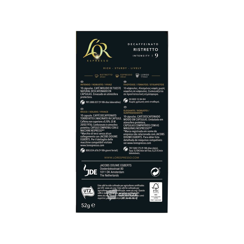 L'OR Espresso Ristretto Decaffeinato kompatibilní kapsle Nespresso 10 ks přinášejí silný espresso zážitek v jemnějším, bezkofeinovém provedení. Jsou ideální volbou pro moderní milovníky kávy, kteří hledají plnou chuť bez kompromisů.