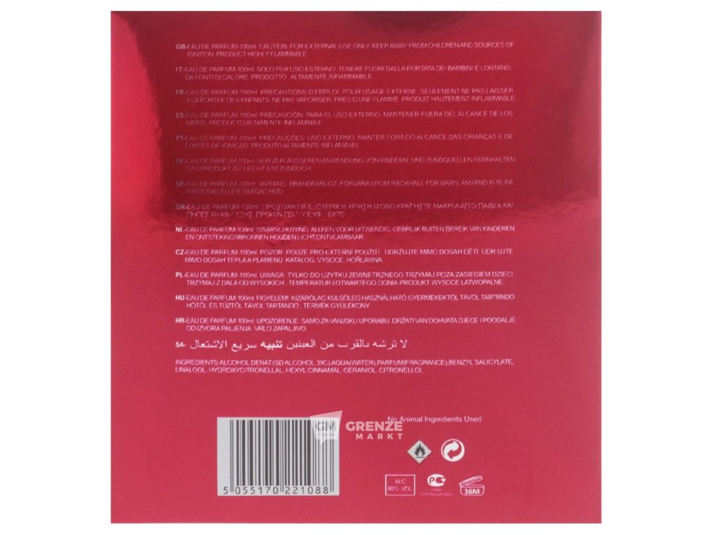 Alcohol Denat (SD Alcohol 39C), Aqua (Water), Parfum (Fragrance), Benzyl Salicylate, Linalool, Hydroxycitronellal, Hexyl Cinnamal, Geraniol, Citronellol.