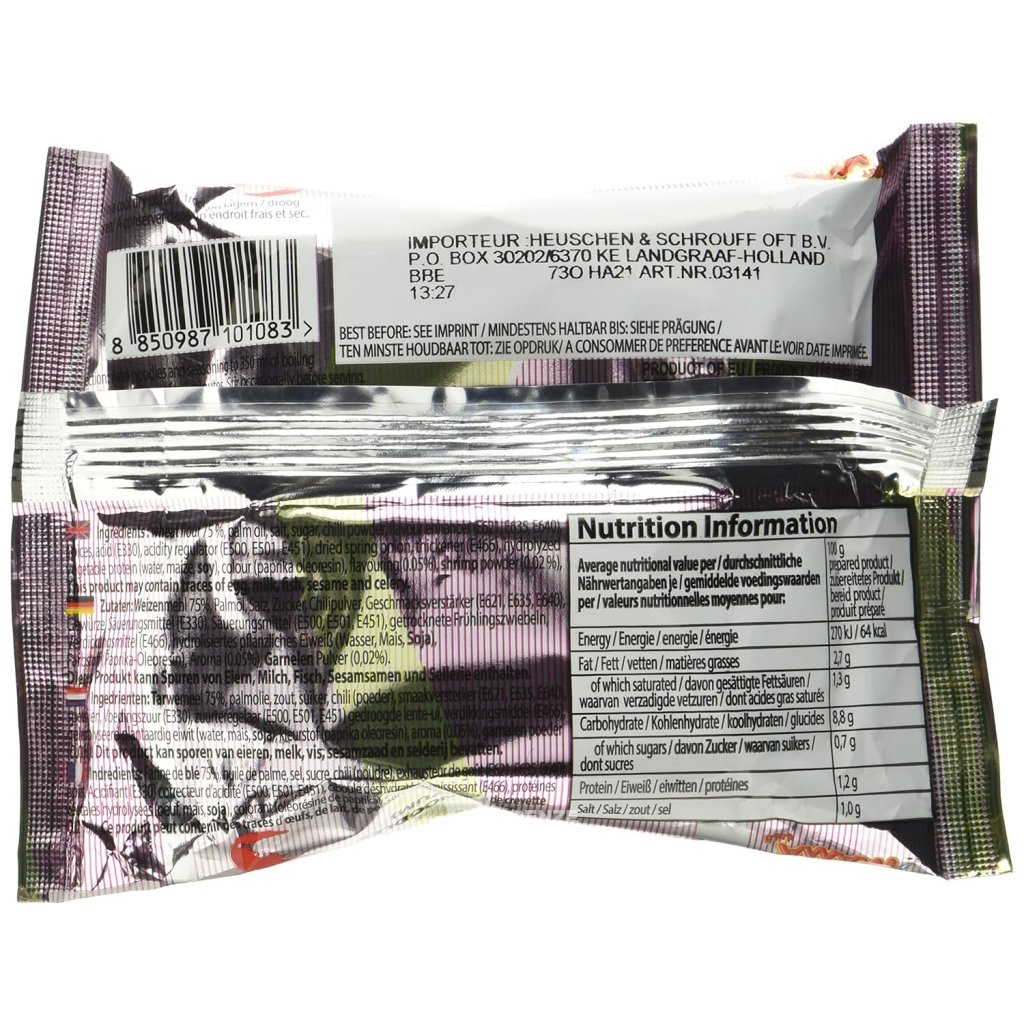 Složení: pšeničná mouka 75%, palmový olej, sůl, cukr, chilli prášek, zvýrazňovače chuti (E621, E635, E640), koření, okyselující látky (E330, E500, E501, E451), sušená jarní cibulka, zahušťovadlo (E466), hydrolyzovaný rostlinný protein. (voda, kukuřice, sója), barvivo (paprikový oleoresin), aroma (0,05 %), krevetový prášek (0,02 %).
