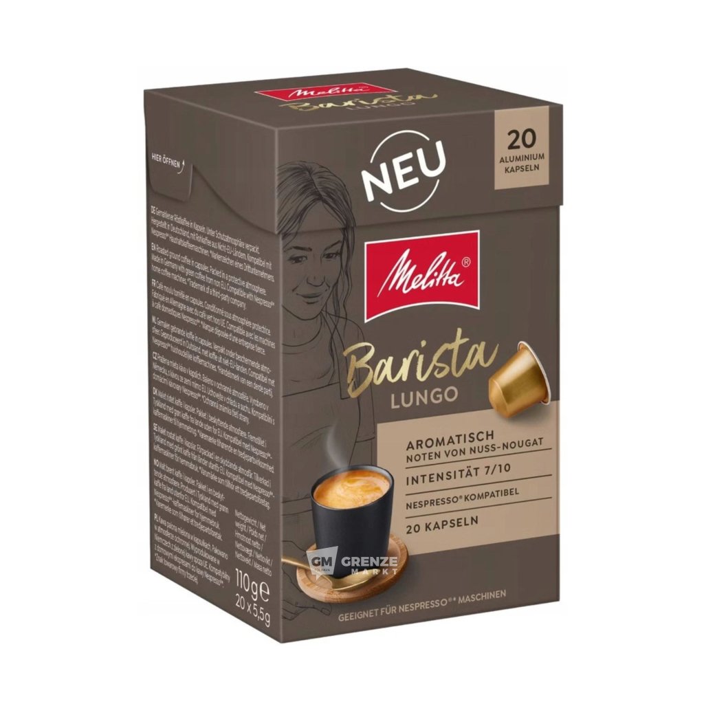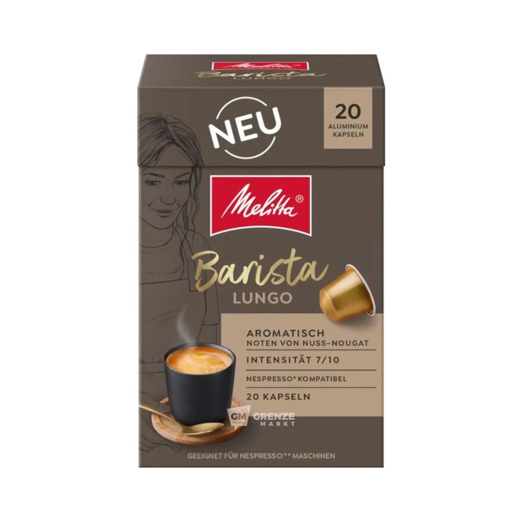 Melitta Barista Lungo kapsle do Nespresso 20 kapslí přinášejí autentický evropský kávový zážitek díky harmonické kombinaci zrn Arabica a Robusta. Každý šálek Lungo má střední intenzitu, je snadno pitelný, ale zároveň bohatý na chuťové vrstvy. Hliníkové kapsle uzamykají aroma a zajišťují stálou kvalitu od prvního po poslední šálek.