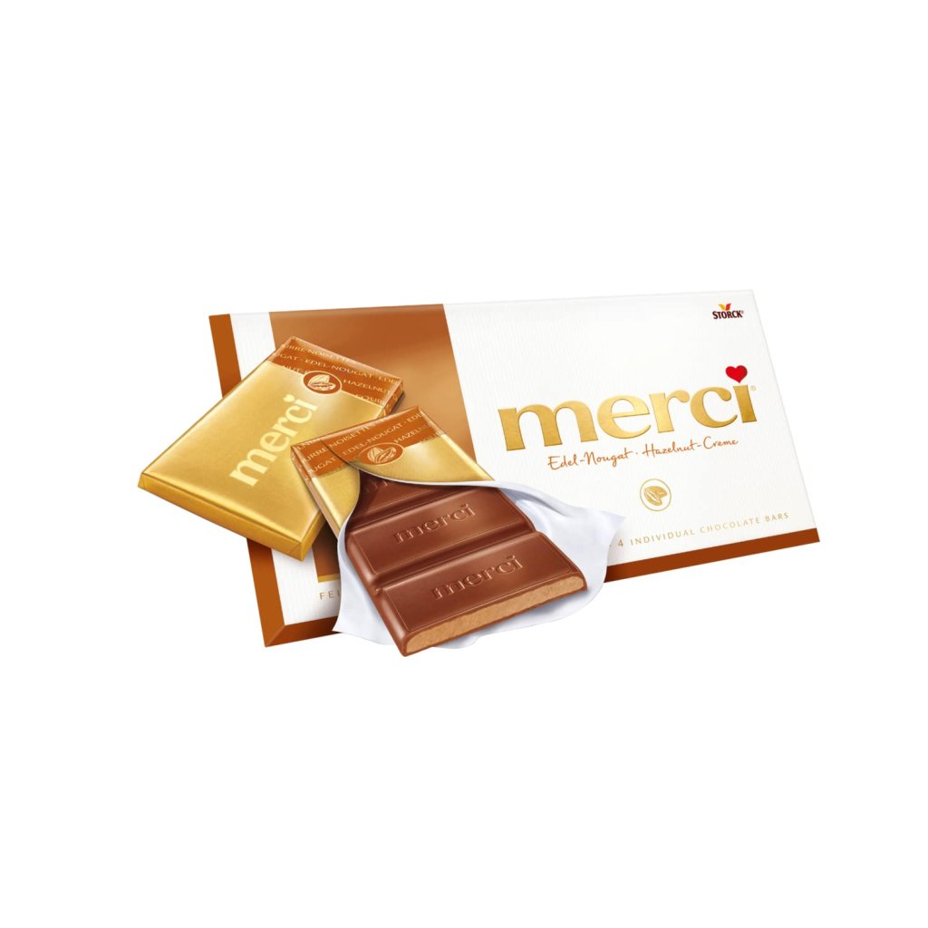 Čokoládová tyčinka merci, která se nesrovnatelně rozpouští v ústech a je jednotlivě zabalená do zlatého papíru, vás zavede do zvláštního světa požitků. Jemná nugátová náplň obalená jemnou plnotučnou mléčnou čokoládou rozbuší srdce každého fajnšmekra.