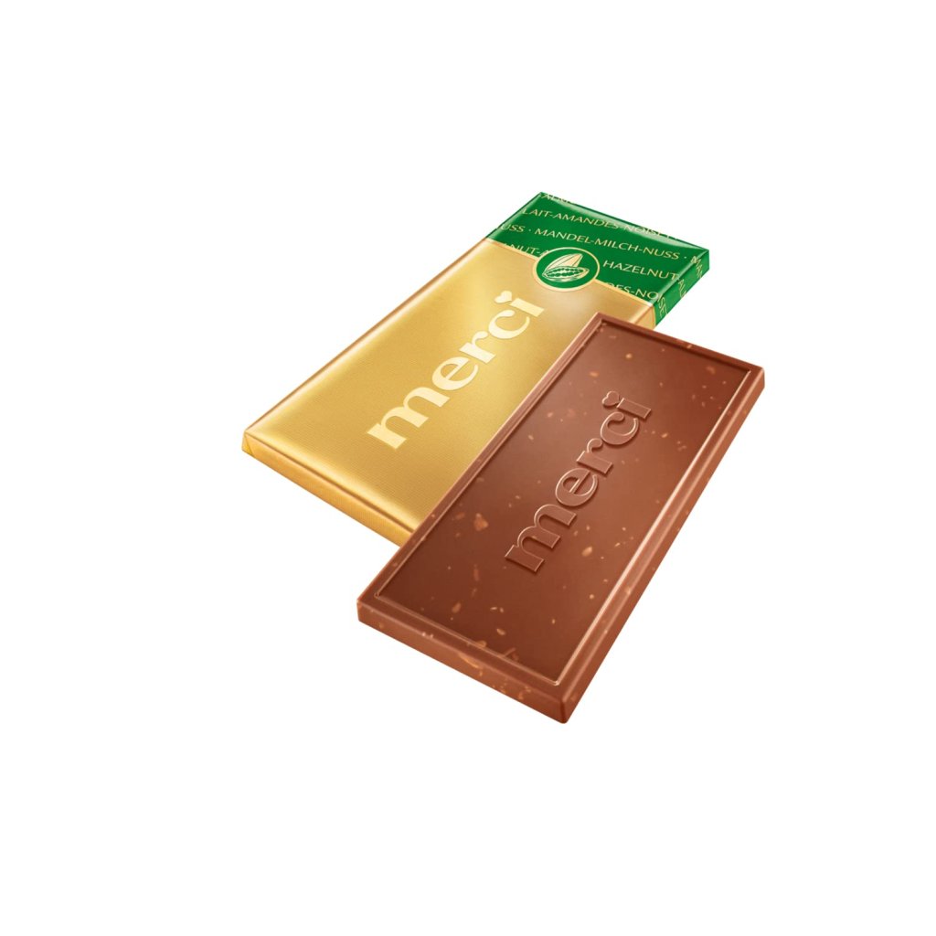 Čokoládová tyčinka merci, která se nesrovnatelně rozpouští v ústech a je jednotlivě zabalená do zlatého papíru, vás zavede do zvláštního světa požitků. Jemné kousky mandlí a lískových oříšků obalené v jemné plnotučné mléčné čokoládě rozbuší srdce každého fajnšmekra.