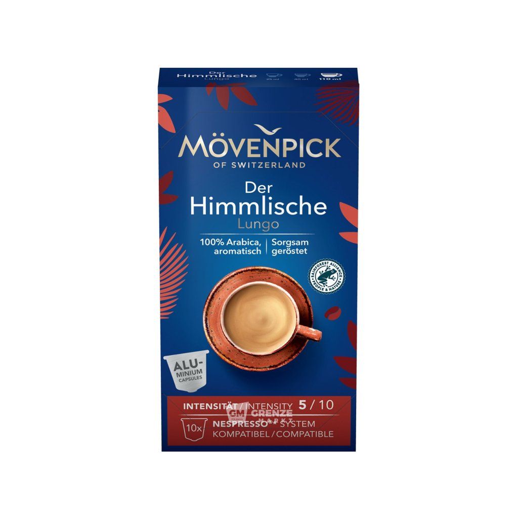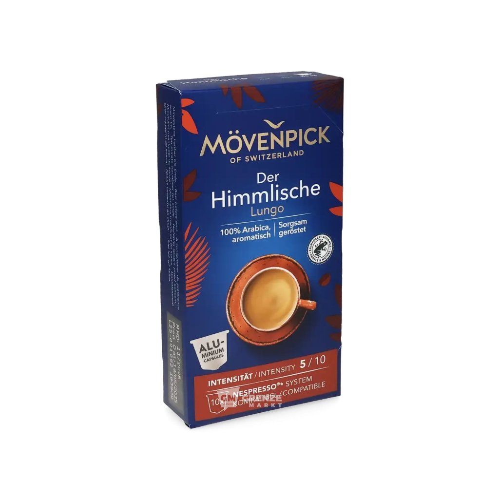 Mövenpick Der Himmlische Lungo 10 kapslí 57g je dokonalou volbou pro všechny milovníky kávy, kteří ocení vyváženou a jemnou chuť. Spojení plného aroma a lahodné vůně přináší zážitek z kávy, který skutečně připomíná „nebe v šálku“.
