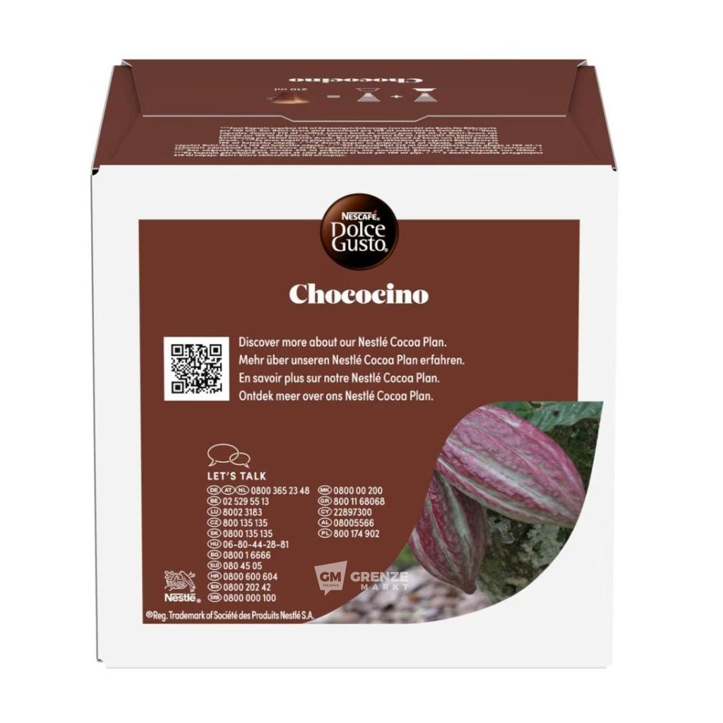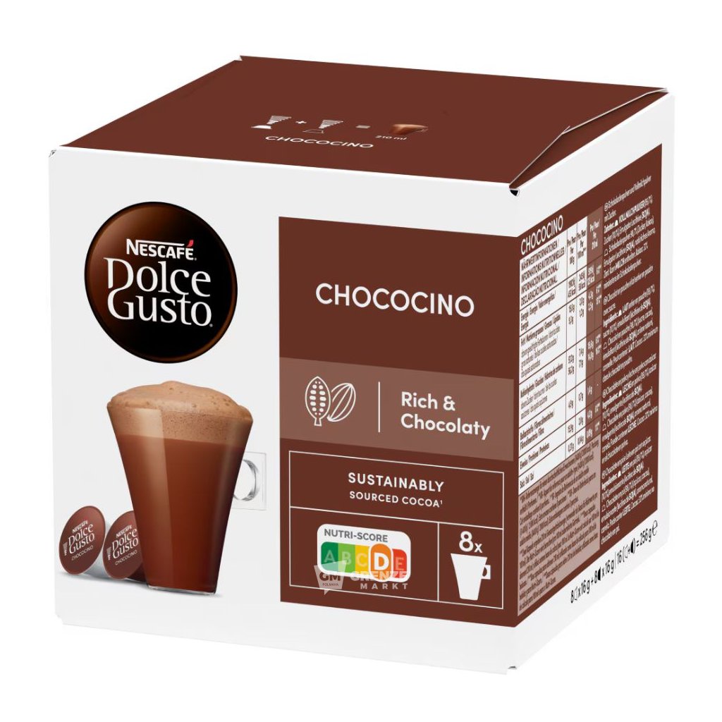 Nescafé Dolce Gusto Horká čokoláda Chococino 16 kapslí přináší lahodný zážitek z horké čokolády s krémovou mléčnou pěnou a výraznou kakaovou chutí. Spojení kvalitního kakaa, vyvážené sladkosti a jemných vanilkových tónů potěší děti i dospělé.