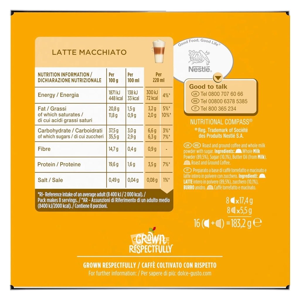 Nescafé Dolce Gusto Latte Macchiato je dokonalou kombinací pečlivě vybraných zrn Arabica a Robusta, která dodávají bohaté aroma, jemnou chuť a vyváženou intenzitu. Užijte si kávu jako z kavárny pohodlně u vás doma.