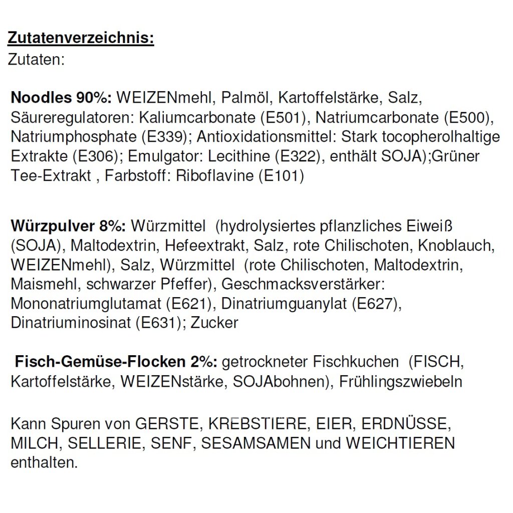 prášek do polévky: koření (červený pepř, česnek, černý pepř, cibule), zvýrazňovač příchutí (E621, E627, E631), prášek ze sójové omáčky (sůl, sójové boby ), glukóza, prášek z palmového oleje, cukr, prášek z papriky.