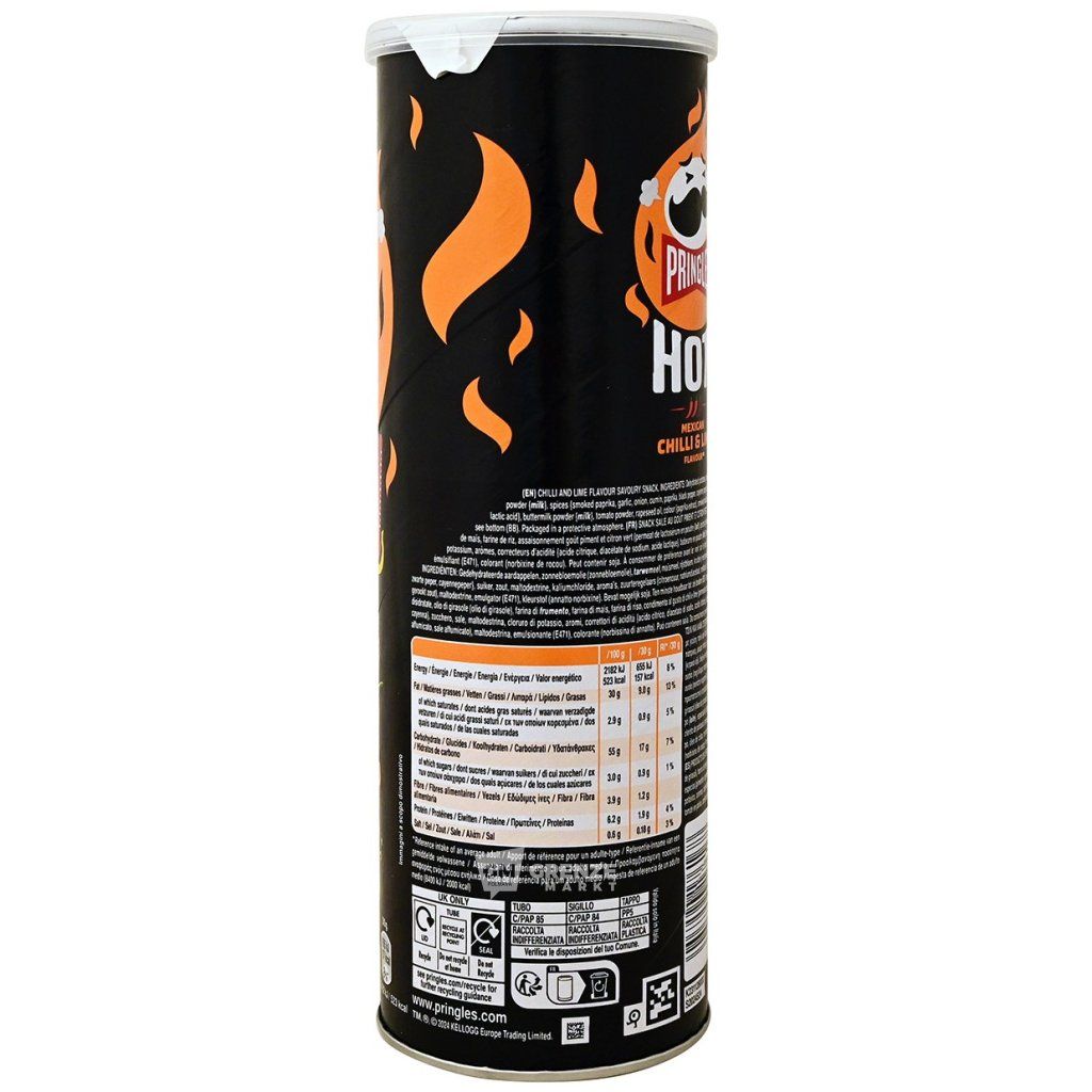 Pringles bramborové chipsy Hot Mexican Chili & Limetka 160 g přinášejí jedinečný chuťový zážitek díky dokonalé kombinaci pikantního mexického chilli a svěží kyselosti limetky. Každý křupavý kousek potěší vaše chuťové buňky a osvěží vás, ideální pro milovníky výrazných a originálních chutí.