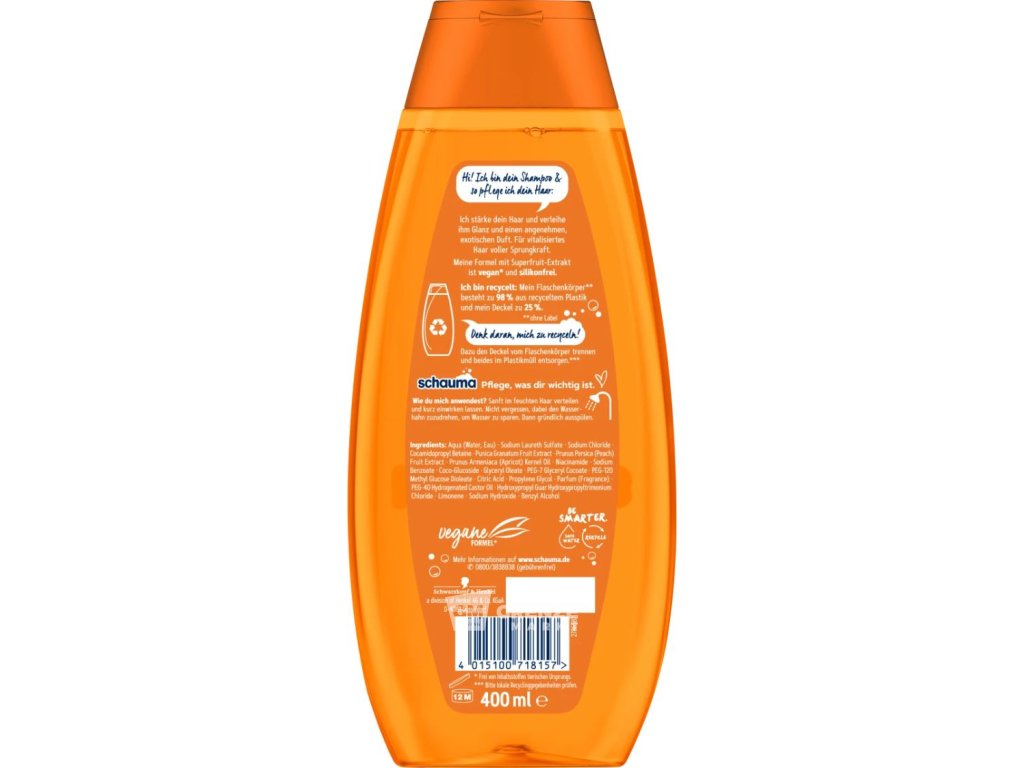 Díky složení bez silikonů a veganským ingrediencím tento šampon nejen pečuje o vaše vlasy, ale je také šetrný k životnímu prostředí. Láhev je vyrobena z 98 % z recyklovaného plastu, což snižuje plastový odpad a podporuje udržitelnost. Vyzkoušejte Schauma Fruit + Vitamin šampon 400ml pro zdravé a lesklé vlasy plné života.