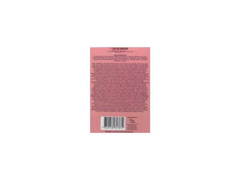 Alcohol denat., aqua (water), parfum (fragrance), linalool, benzyl salicylate, hydroxycitronellal, coumarin, limonene, geraniol, citronellol, hexyl cinnamal, isoeugenol, citral, alpha-isomethyl ionone, benzyl alcohol, farnesol, CI 16255.