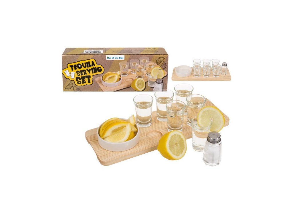 Souprava obsahuje 6 skleniček, dřevěný podnos s vyfrézovanými otvory proti sklouznutí, keramickou misku na plátky citronu a solničku. Servírovací souprava Tequila je skvělým tipem na dárek pro milovníky tequily a ozvláštní každou oslavu, narozeninovou párty nebo zahradní grilování.
