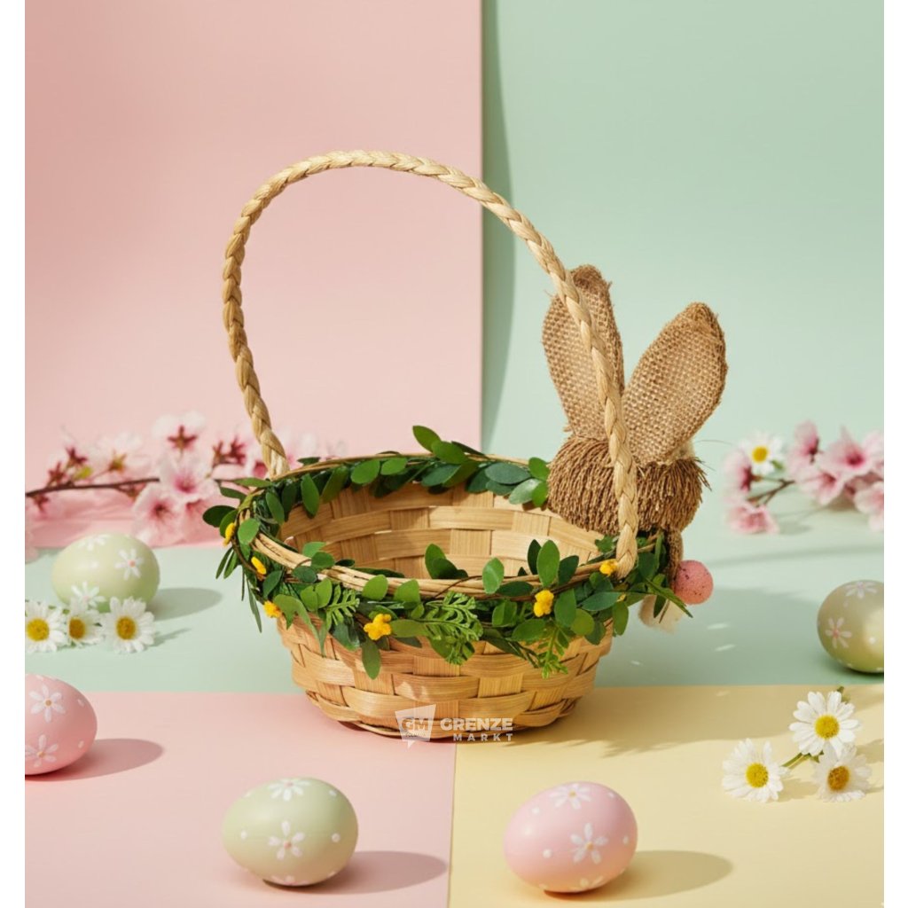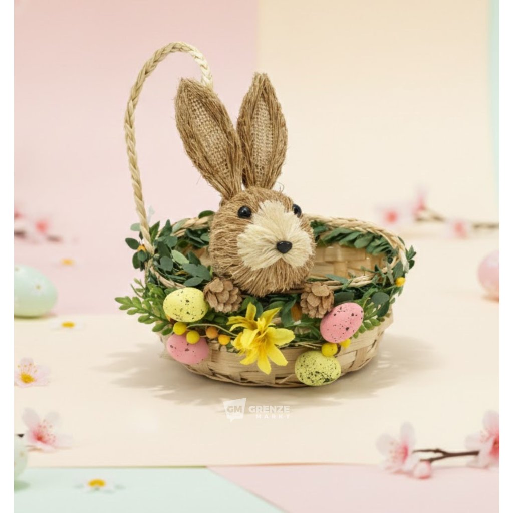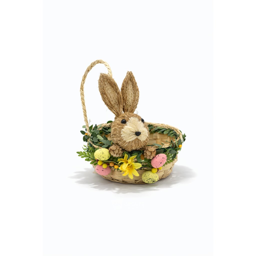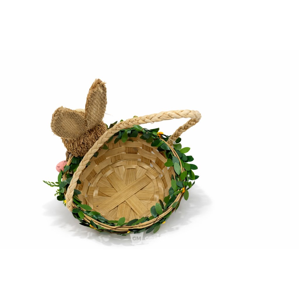 Košík je upleten z přírodní slámy ve stylu ručně vyrobené dekorace, díky čemuž působí pevně, ale zároveň jemně a ekologicky. Hlavním ozdobným prvkem je roztomilý zajíček s dlouhýma ušima lemovanými jutovou látkou, který se schovává u boku košíku, doplněný zeleným věnečkem kolem okraje. Slámový velikonoční košík je vhodný jako dárkový košík na čokoládu či barevná vajíčka, dekorace velikonočního stolu, police, pracovního koutku nebo jako rekvizita pro jarní focení.