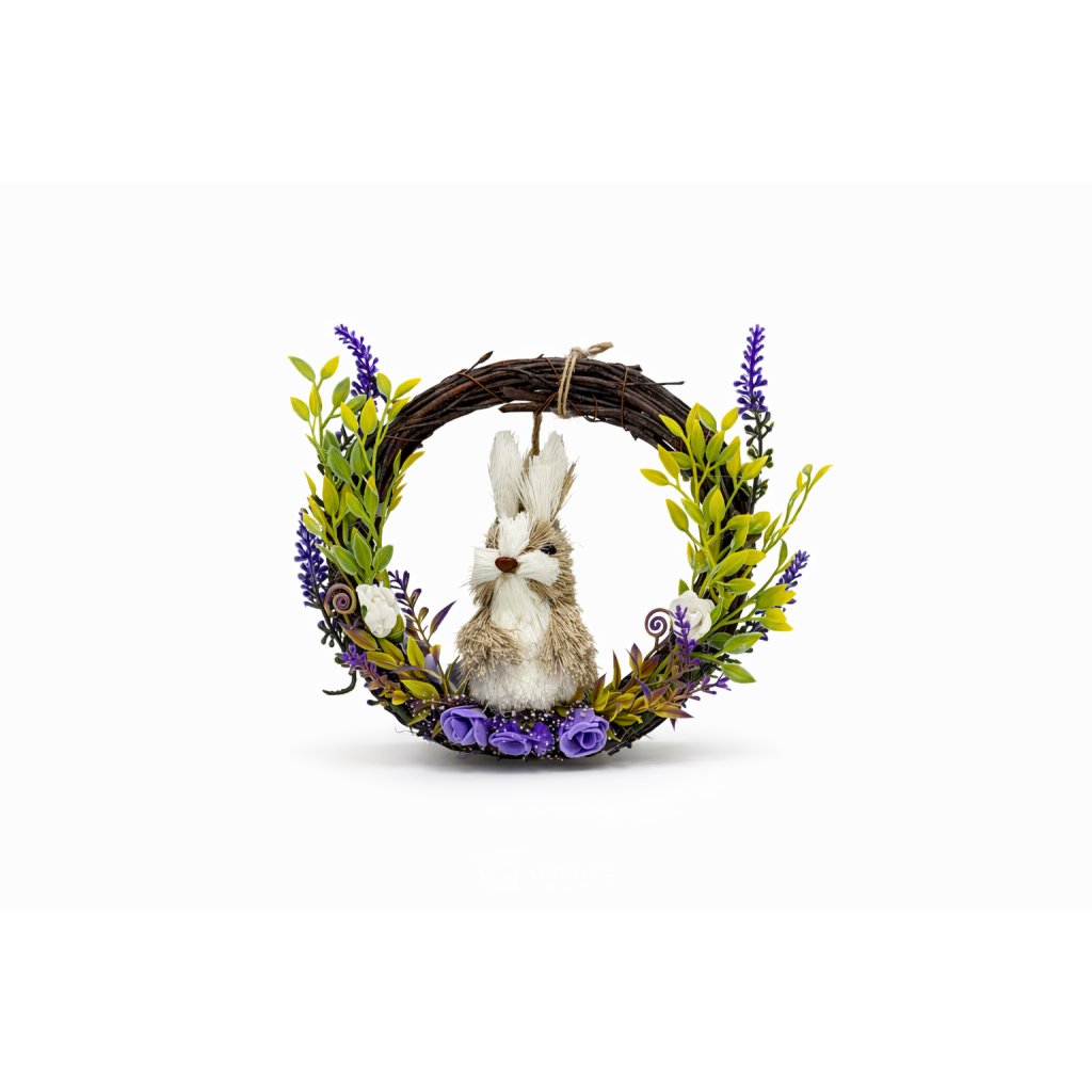 Slámový velikonoční věnec B23-19 přitahuje pozornost vyváženou kompozicí, kde je zajíček hlavním motivem, podepřeným spodním trsem fialových růží a obklopeným po stranách levandulí a zelenými listy. Kombinace fialové, zelené a přírodně hnědé barvy vytváří harmonický a jemný celek, který se snadno začlení do jarní výzdoby interiéru.