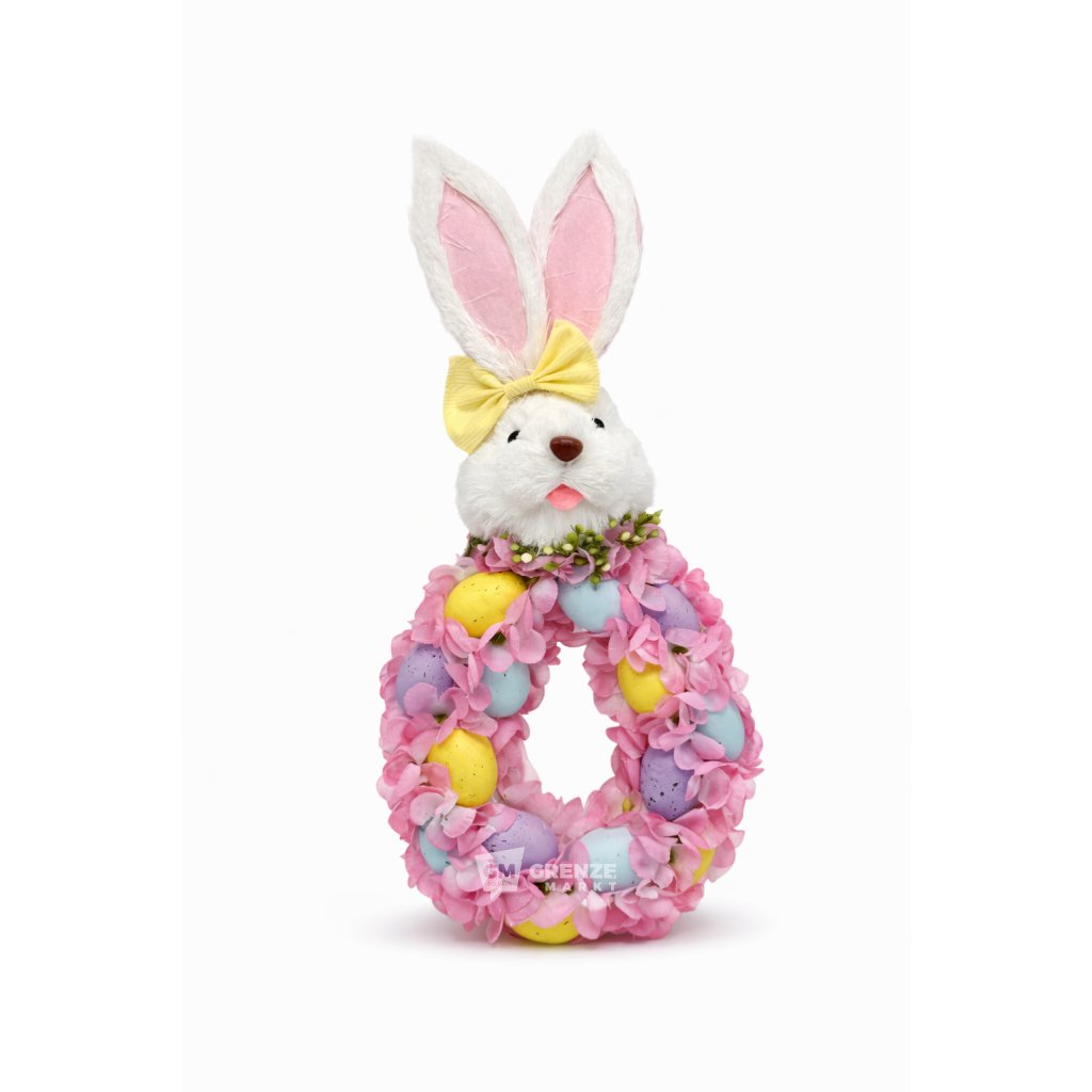 Hlava zajíčka je vyrobena z jemného bílého materiálu s dlouhými vztyčenými oušky, doplněnými o roztomilou mašli, která podtrhuje dívčí charakter dekorace. Tělo tvoří oválný věnec s otevřeným středem, bohatě zdobený pastelově růžovými květy a barevnými velikonočními vajíčky ve žlutých, mátově zelených a světle fialových odstínech. Díky harmonické barevnosti a prostorovému 3D uspořádání se slámový velikonoční věnec stává výrazným prvkem při zavěšení na vstupní dveře, jako dekorace obývacího pokoje nebo dětského prostoru během svátečního období.