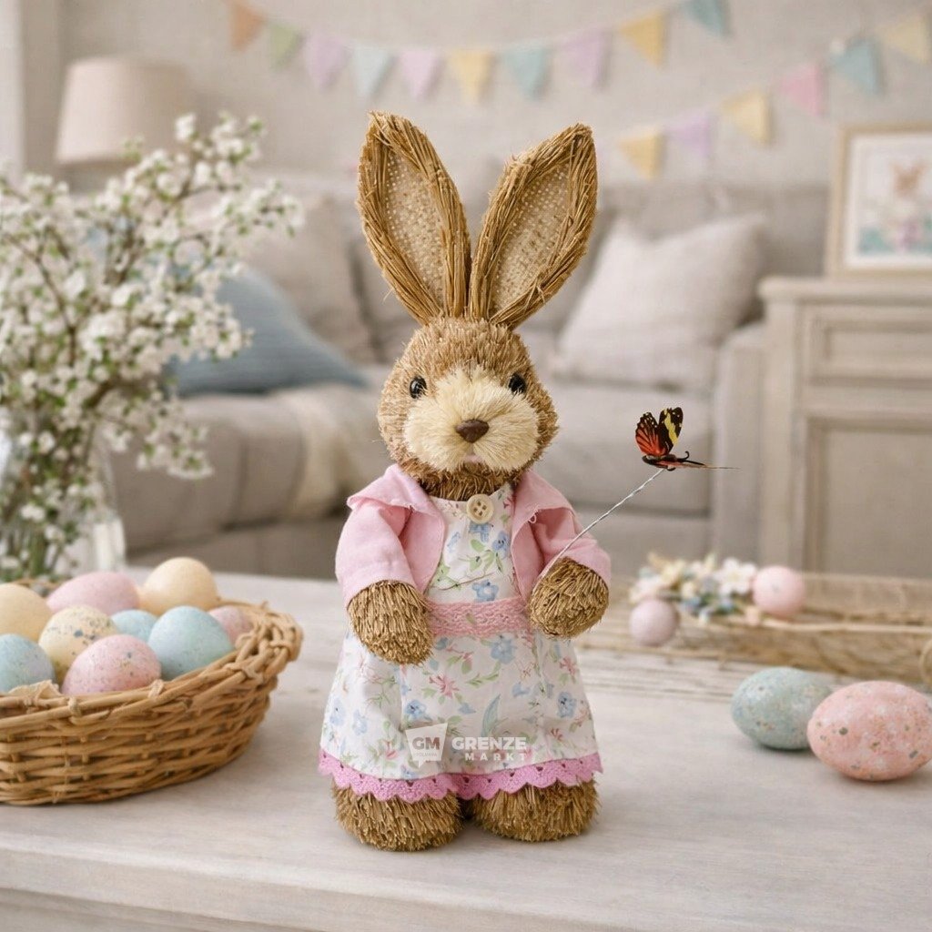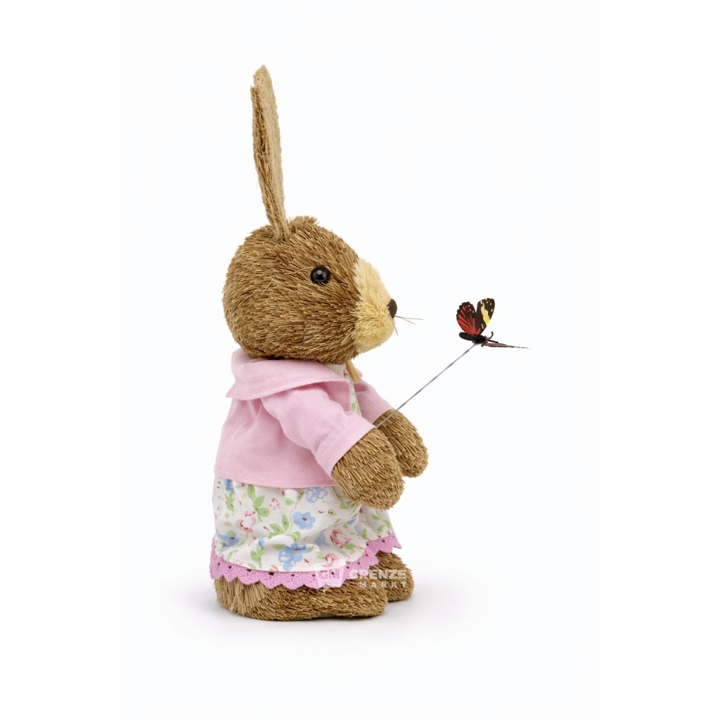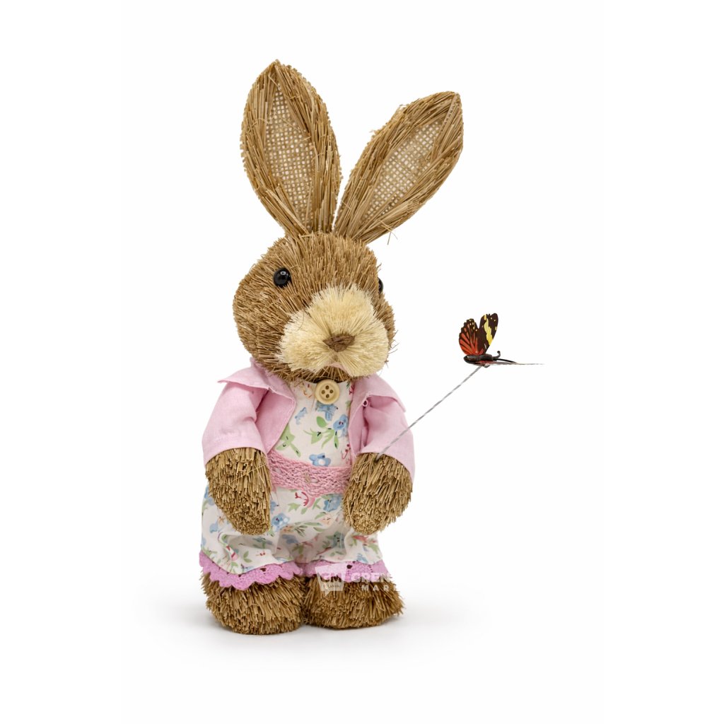 Slámový velikonoční zajíc holka 0737-01 28 cm přináší hřejivý a roztomilý dojem už na první pohled. Tvarování malé holčičky v šatech s květinovým motivem v pastelových barvách, jemná růžová bunda a drobný motýlek vytvářejí harmonický celek, který se stane výrazným velikonočním dekoračním prvkem.