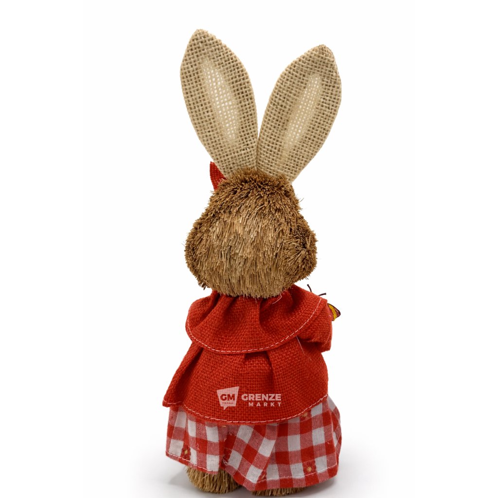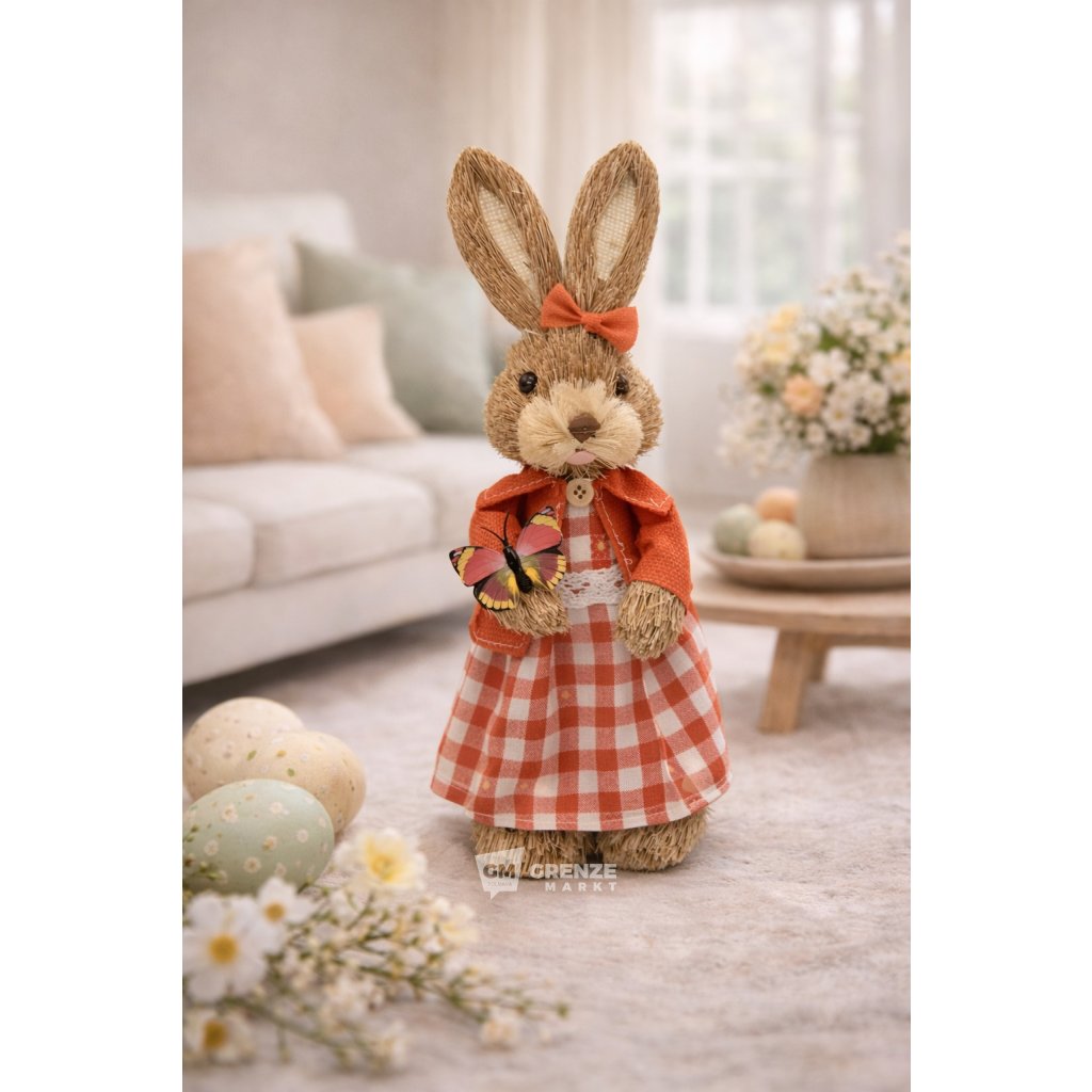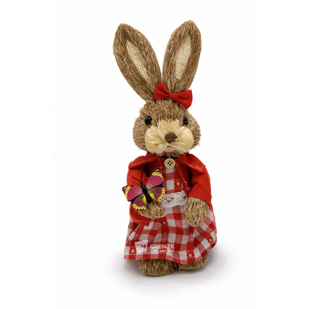 Slámový velikonoční zajíc holka S25-13 28 cm je dekorace plná jarní atmosféry, ideální do domácností, obchodů nebo kaváren během velikonočního období. Roztomilý vzhled, červená kostkovaná sukně a jemná mašle dodávají výrobku přirozené kouzlo a útulný charakter.