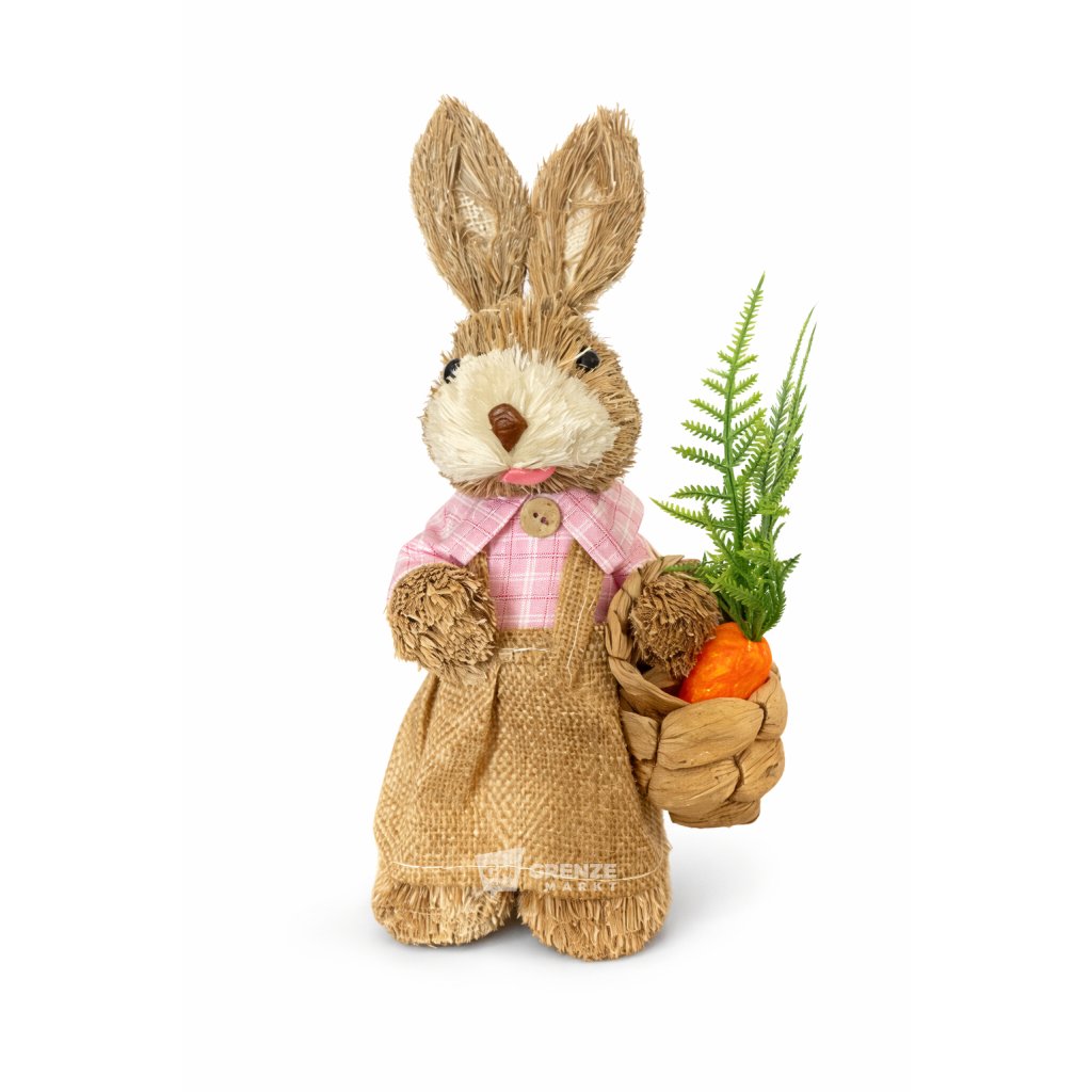Slámový velikonoční zajíc holka S25-19 21cm je dekorace inspirovaná tradičními velikonočními motivy, která v sobě spojuje přírodní materiály a jemný dívčí vzhled. Roztomilý zajíček v šatech s košíkem s mrkví působí hřejivě a přináší do interiéru klidnou sváteční atmosféru.