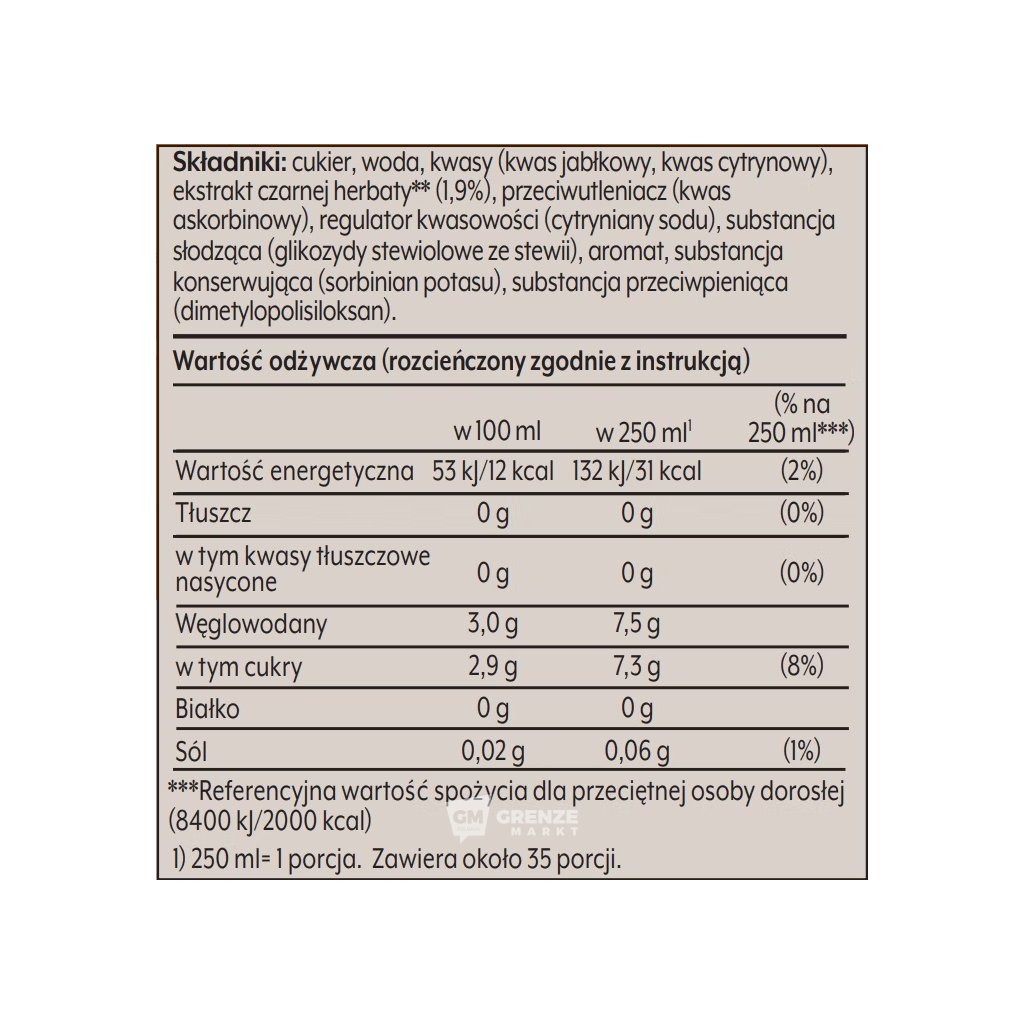 Cukr, voda, kyseliny (kyselina jablečná, kyselina citronová), extrakt z černého čaje (1,9 %), antioxidant (kyselina askorbová), regulátor kyselosti (citrát sodný), sladidlo (steviol-glykosidy z rostliny stévie), aroma, konzervant (sorban draselný), protispékavá látka (dimetylpolysiloxan).