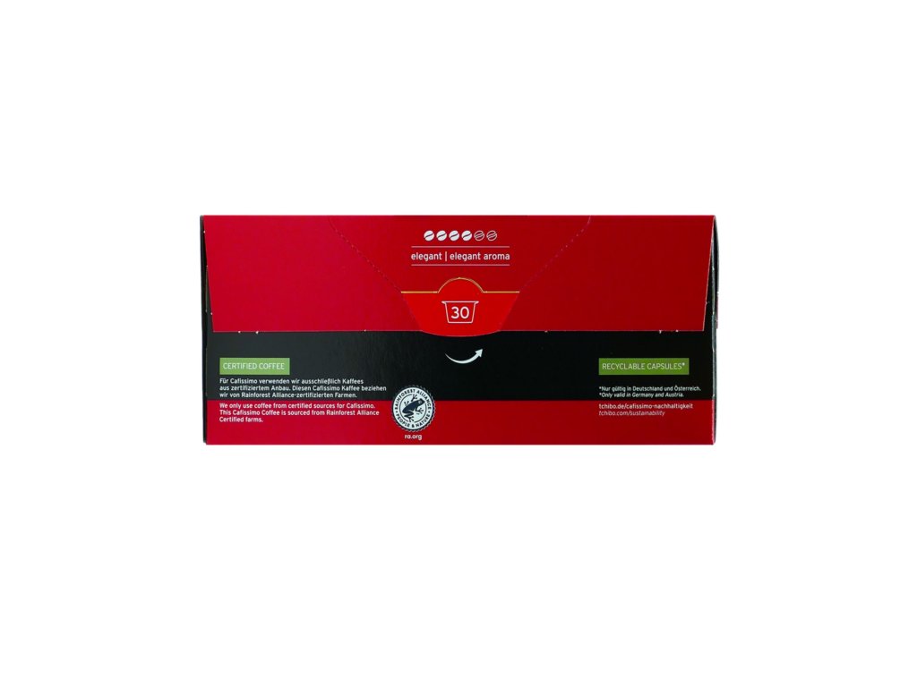 Tchibo Cafissimo Espresso elegant nabízí autentický zážitek italského espressa – silné, ale přitom jemné, s elegantním charakterem. Určeno pro kávovary Cafissimo, každá kapsle vám umožní připravit šálek dokonale voňavé kávy během několika vteřin. Ovocné tóny se snoubí s lehkým nádechem čokolády a vytvářejí jemnou, dlouhotrvající dochuť, které nelze odolat.