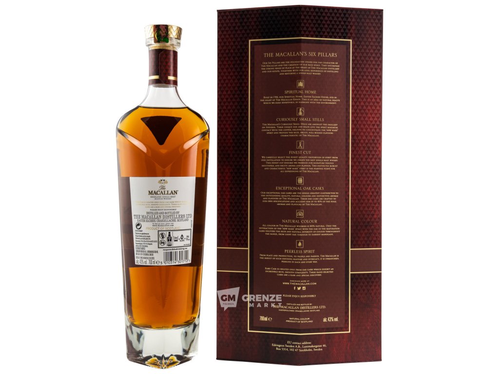 Tento mimořádný sběratelský kousek je skutečnou raritou. The Macallan Rare Cask Release 2020 pochází ze 16 různých druhů sudů Sherry, které si osobně vybíral výrobce Macallan Master Whisky Bob Dalgarno. Když otevřete velmi exkluzivně navrženou láhev, zavoní k vám vůně jemných tónů vanilky, rozinek, jablka, citronu a pomeranče. Chuť mahagonově zbarveného single maltu má velmi intenzivní rozinkové, vanilkové a čokoládové tóny, které intenzivně přetrvávají v ústech po velmi dlouhou dobu.