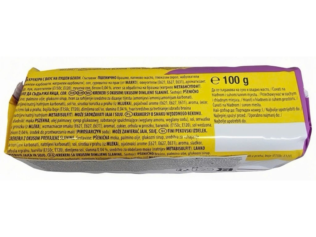 Pšeničná mouka, palmový olej, glukózový sirup, extrakt z ječmenného sladu, jedlá sůl 2,4 %, vejce, kypřicí látky (uhličitany amonné, uhličitany sodné), sušená syrovátka (z mléka), aroma uzeniny, zvýrazňovače chuti (E621, E631, E627), cibulový prášek, dextróza, cukr, prášek ze slaniny 0,1 %, barviva (amoniakový karamel, karmíny), přípravek na úpravu mouky (metabisulfit sodný), směs koření.