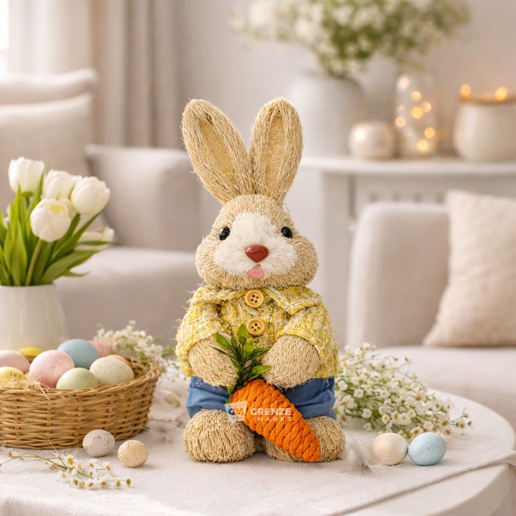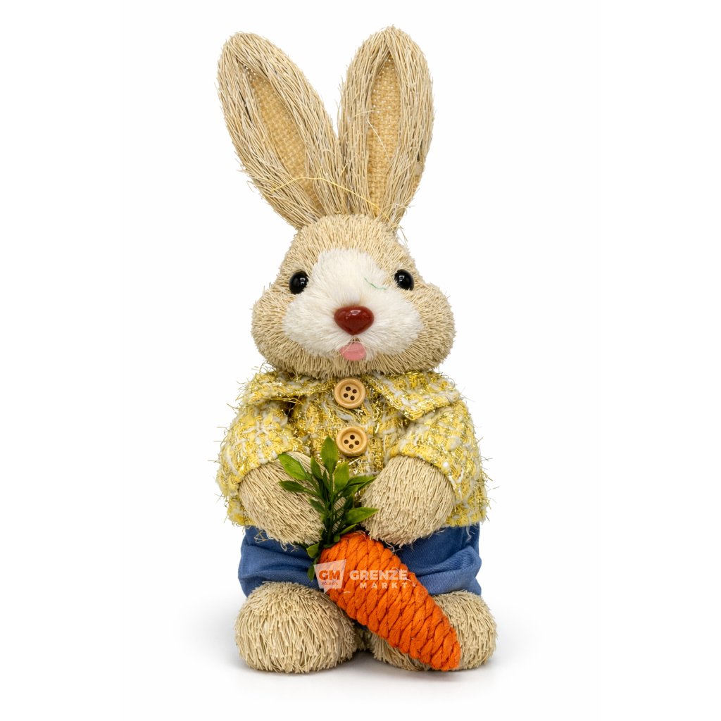 Velikonoční slaměný zajíc chlapec S25-01 28 cm je přírodní dekorace, která okamžitě upoutá pozornost během sváteční sezóny. Zajíc stojí pevně na nohou, s dlouhými vztyčenými ušima, přátelským výrazem, žlutým kabátkem a výraznou oranžovou mrkví, což vytváří veselou a hřejivou jarní atmosféru.
