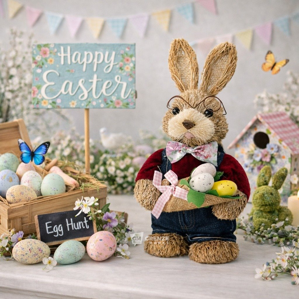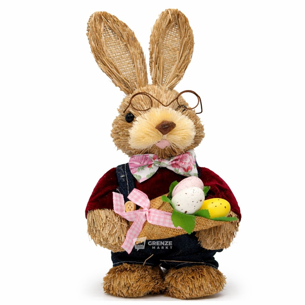 Velikonoční slaměný zajíc chlapec S25-03 28 cm rozzáří každý interiér hned na první pohled. Vysoké uši, kulaté brýle, jemná mašle a košík s pastelovými velikonočními vajíčky vytvářejí milý a přívětivý vzhled. Přírodní slaměný materiál dodává dekoraci teplý, venkovský charakter a skvěle se hodí na polici v obývacím pokoji, ke vchodu nebo do sezónně laděného koutku.