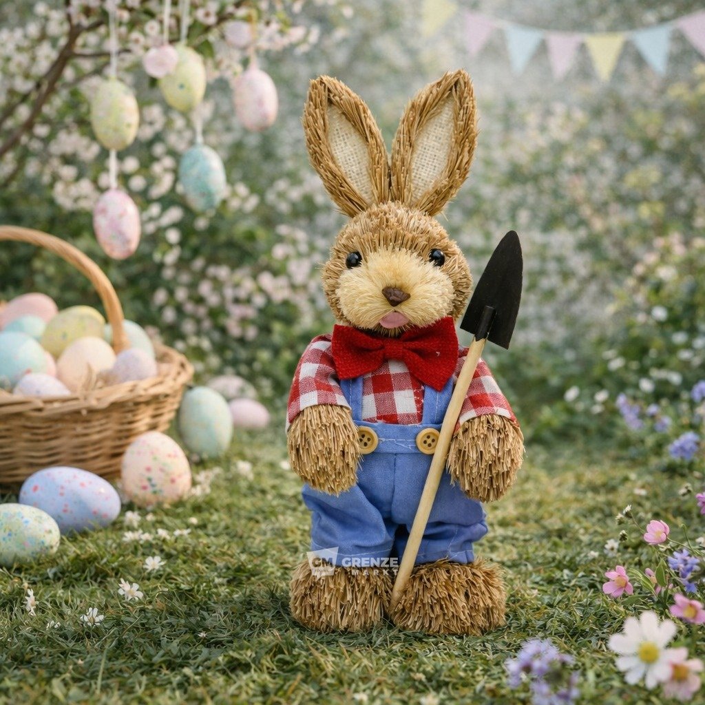 Dekorace je vyrobena z přírodní slámy a doplněna látkovými detaily, pečlivě zpracovanými v duchu ručně vyrobené práce. Působí přirozeně, útulně a zároveň esteticky. Stabilní stojící provedení a kompaktní velikost umožňují snadné kombinování s velikonočními vejci, proutěnými košíky nebo dalšími sezónními dekoracemi.