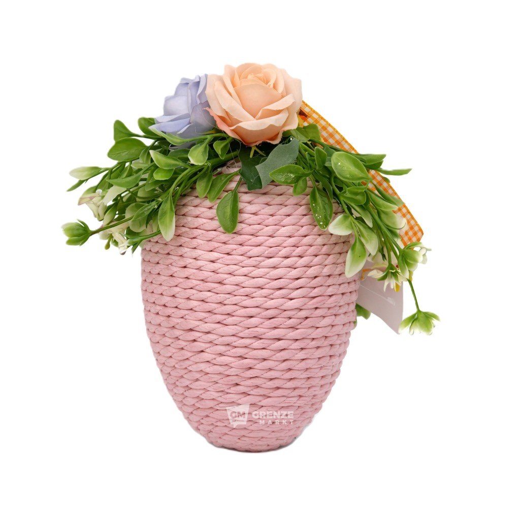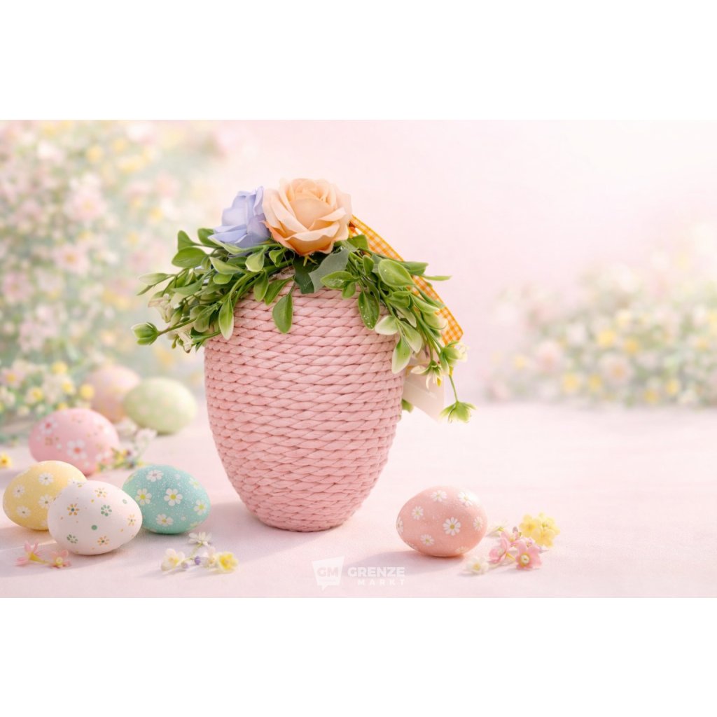 Velikonoční vejce růžové S25-44A 21 × 11 × 11 cm přináší jemnou a elegantní krásu, která zútulní váš interiér během velikonočního období. Originální tvar vejce doplněný dekorativními květy a umělými listy vytváří harmonický a esteticky příjemný vzhled. Jemné pastelové tóny umožňují snadné sladění s různými styly interiéru.