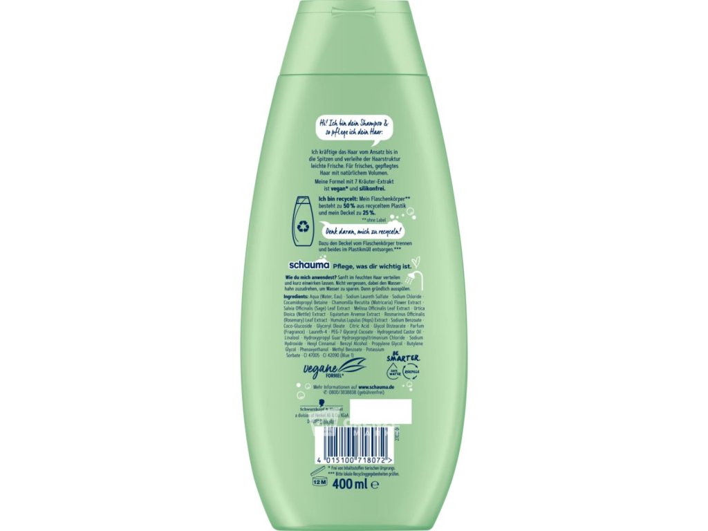 Dầu gội 7 loại thảo mộc Schauma 400ml là giải pháp chăm sóc tóc lý tưởng cho tóc thường đến tóc nhanh bết dầu, giúp làm sạch sâu nhưng vẫn giữ được độ ẩm tự nhiên. Công thức đặc biệt với chiết xuất từ 7 loại thảo mộc giúp tóc chắc khỏe từ gốc đến ngọn, mang lại cảm giác sảng khoái và tươi mát. Không chứa silicon và thành phần có nguồn gốc động vật, sản phẩm này phù hợp với lối sống thuần chay và thân thiện với môi trường.